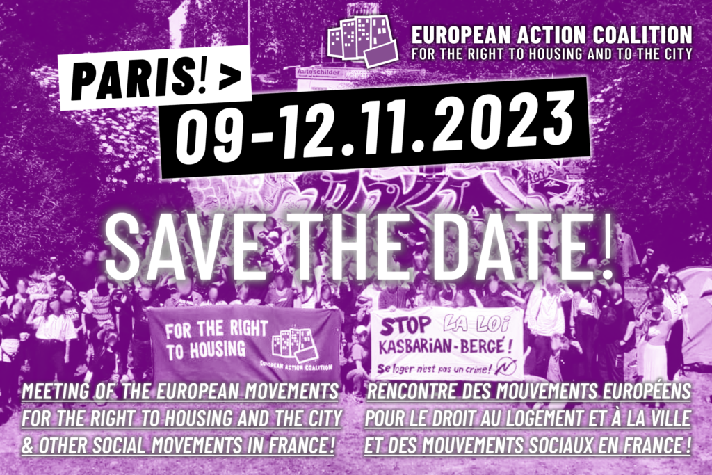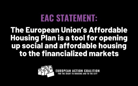 The European Action Coalition for the Right to Housing and to the City is a convergence process between movements from different cities in several european countries fighting for the respect of these fundamental rights. After having campaigned independently for years, those movements (groups and, social movements composed by tenants, slum/ self-built neighborhoods dwellers, squat residents, victims of inadequate housing, victims of eviction or affected by indebtedness, professionals and researchers) felt the need to gather in order to strengthen this fight to take common action and common positions on European Housing issues. Read More >